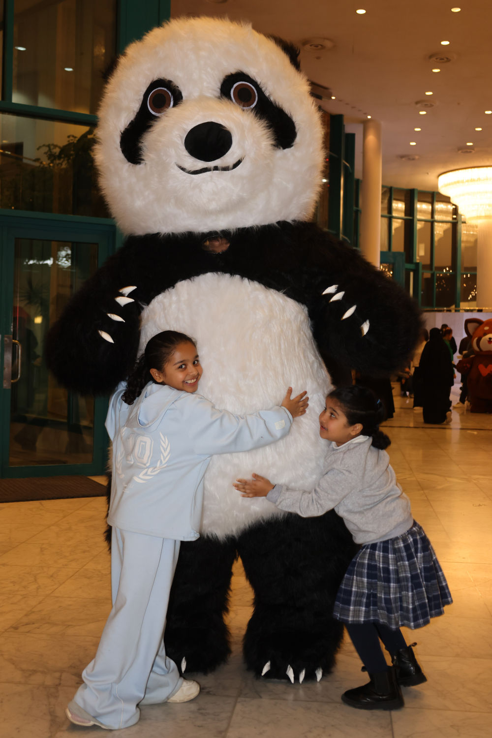 ↑1月11日,在沙特阿拉伯首都利雅得文化宫举行的“新春大集”活动上,孩子们与大熊猫人偶合影互动。