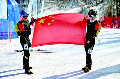 2月9日,中国选手包揽滑雪登山女子短距离项目前四名。图为次旦玉珍(左)与队友于婧萱庆祝。