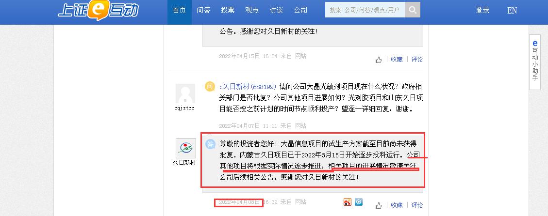 不过,久日新材在今年4月份在上证e互动上回复投资者提问“请问公司大晶光敏剂项目现在什么状况?政府相关部门是否批复?公司其他项目进展如何?光刻胶项目和山东久日项目能否按之前计划的时间节点顺利投产?”时却表示,大晶信息项目的试生产方案截至目前尚未获得批复。内蒙古久日项目已于2022年3月15日开始逐步投料运行。公司其他项目将根据实际情况逐步推进。