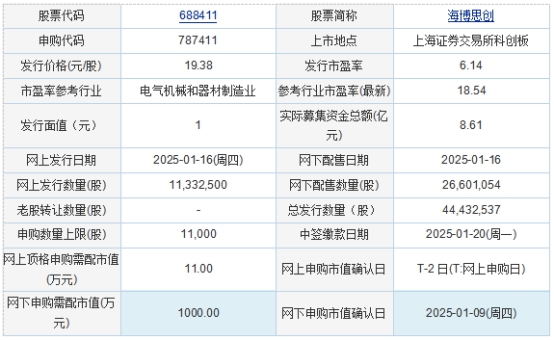 海博思创2025年1月15日披露的首次公开发行股票并在科创板上市发行公告显示,按本次发行价格19.38元/股和4,443.2537万股的新股发行数量计算,若本次发行成功,预计公司募集资金总额86,110.26万元,扣除约9,462.97万元(不含增值税)的发行费用后,预计募集资金净额76,647.28万元。