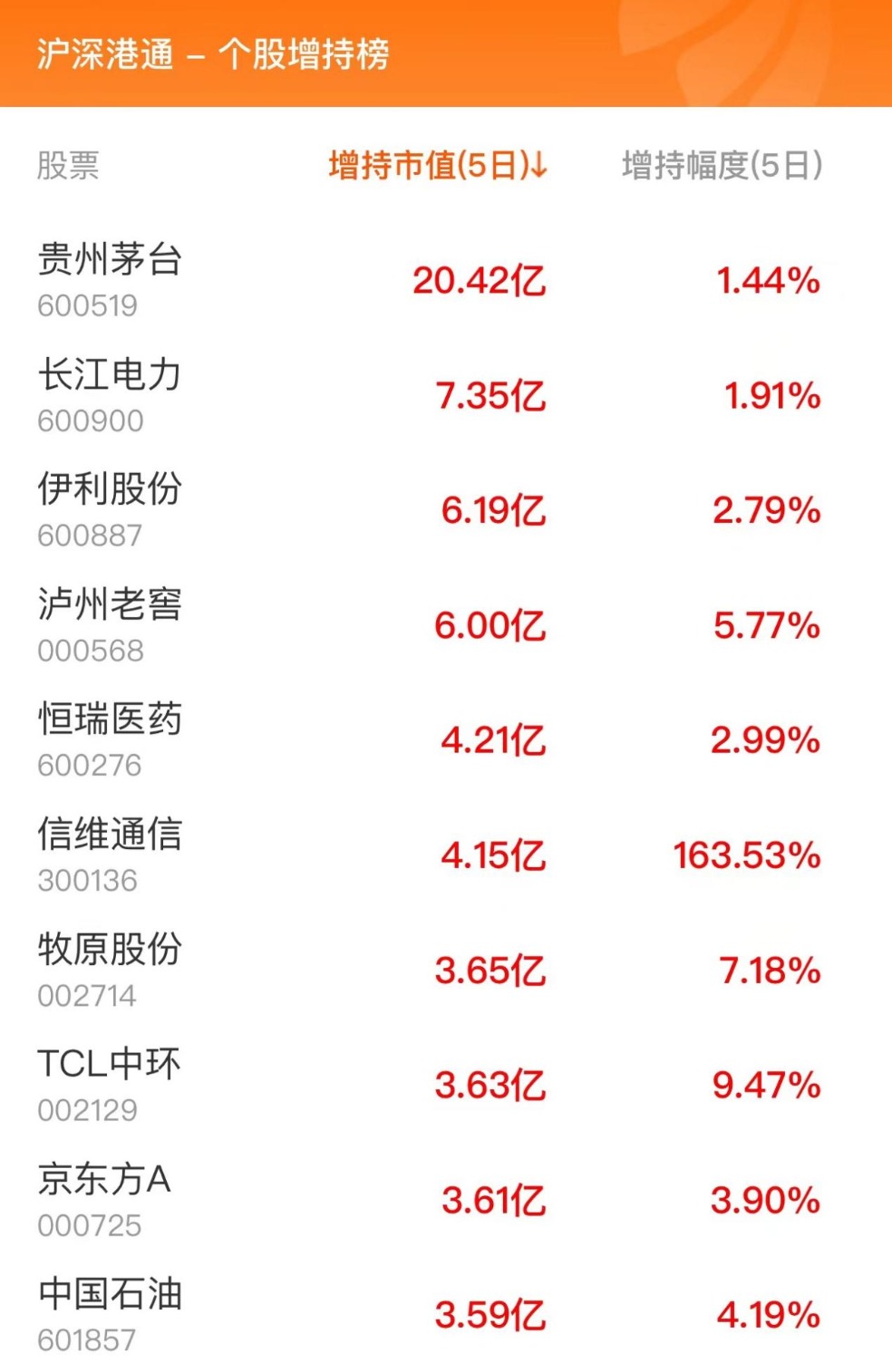 数据显示,近五个交易日,北向资金增持贵州茅台20.42亿元,增持长江电力7.35亿元,增持伊利股份6.19亿元。惠州智能近五日增持幅度最大,增持市值合计4749.75万元。