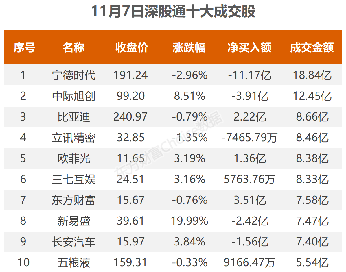 11月7日,两市震荡调整,三大指数均小幅收跌。北向资金当日净卖出45.88亿元,终结此前连续3日净买入;其中,沪股通净卖出24.26亿元,深股通净卖出21.61亿元。北向资金当日成交金额1142.35亿元,占a股总成交额的11.50%。