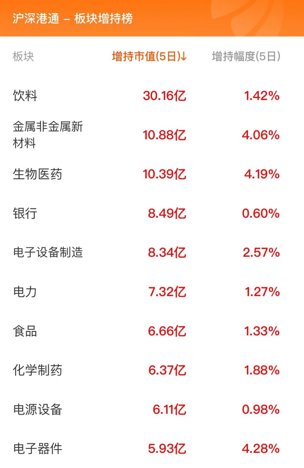 数据显示,近五个交易日,北向资金增持饮料板块30.16亿元,增持金属非金属新材料板块10.88亿元,增持生物医药板块10.39亿元。教育板块近五日增持幅度最大,增幅为32.89%,增持市值合计1.01亿元。